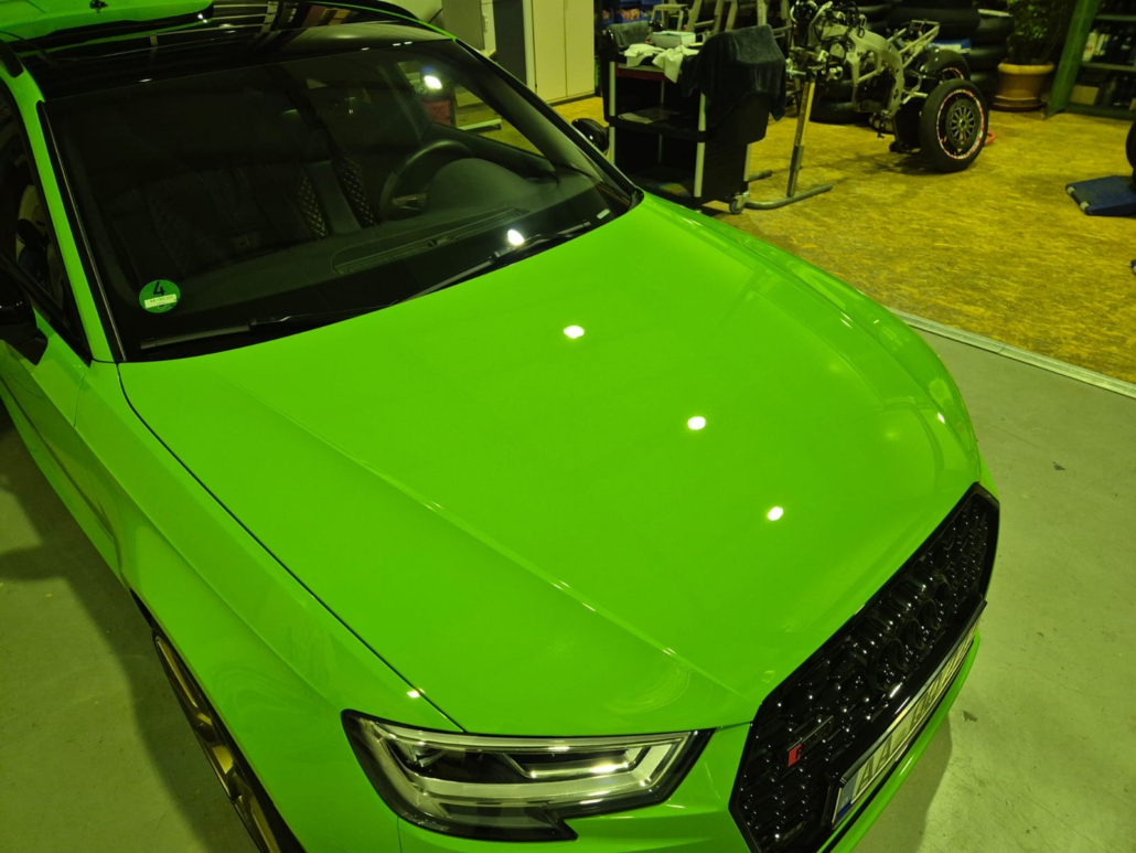 Nach der Vorbereitung wurde der Audi RS3 mit einer hochwertigen Keramikversiegelung behandelt. Diese bildet eine widerstandsfähige Schutzschicht auf dem Lack und sorgt dafür, dass die Oberfläche langfristig geschützt und optisch aufgewertet wird.