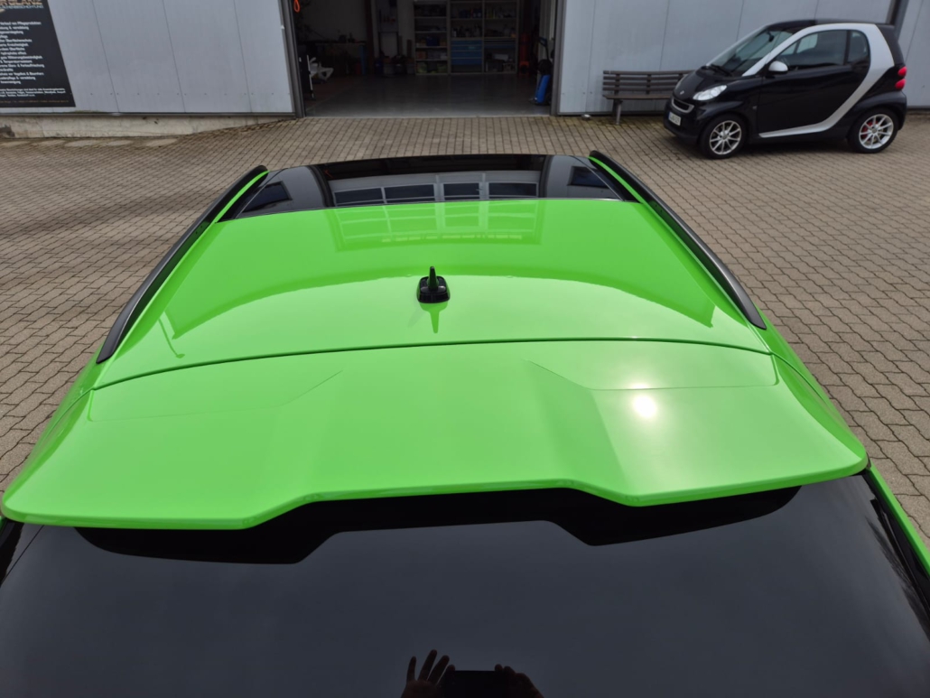 Dazu gehörten eine intensive Fahrzeugwäsche, die gründliche Entfernung von Teer, Flugrost und sonstigen Ablagerungen sowie eine mehrstufige Lackpolitur zur Beseitigung feiner Kratzer und Hologramme. Abschließend wurde der Lack entfettet, damit die Keramikversiegelung optimal haften kann.