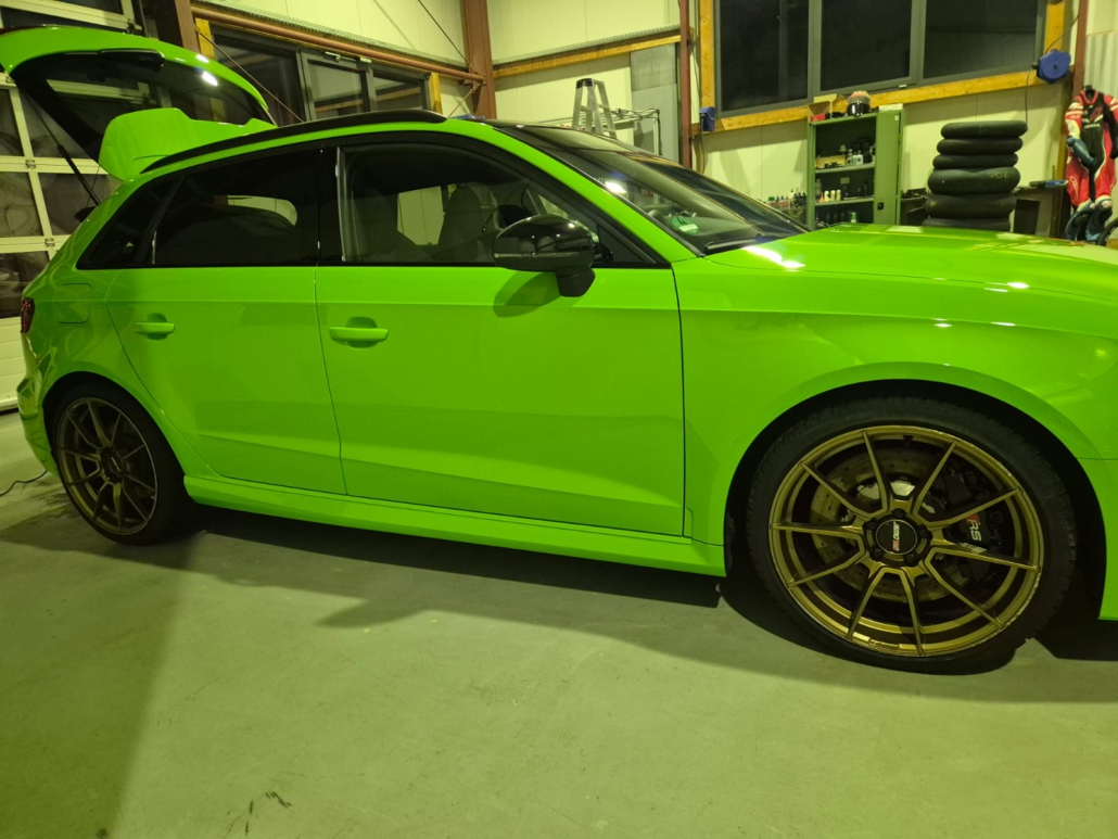 Das Ergebnis kann sich sehen lassen: Der Audi RS3 überzeugt nach der Behandlung mit einem beeindruckenden Tiefenglanz und einer spiegelnden Oberfläche. Die Lackfarbe wirkt deutlich intensiver, während gleichzeitig ein nachhaltiger Schutz gewährleistet ist.